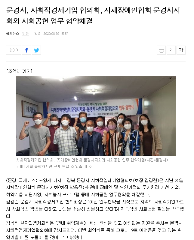 사)경북지체장애인협회 문경시지회 사회적경제 기업협의회(회장 김경란)와 복지향상위한 업무협약식!