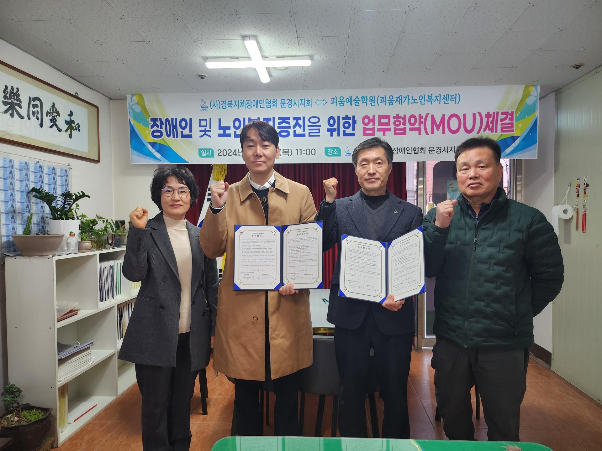 (사)경북지체장애인협회 문경시지회(지회장 직무대리 김성호)는 장애인의 복지향상을 위한 상호지원 및 협력체계 구축의 일환으로 문경시 피움예술학원(대표 최진권)과 3월 21일(목) MOU체결하였다.